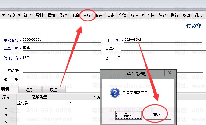 保存之后点审核会有一个这个提示,这个提示是你是否立即生成总账凭证,如果不需要的话点否,以后批量生成,否则点是,立刻生成凭证传入总账系统,总账的付款凭证也就有了。