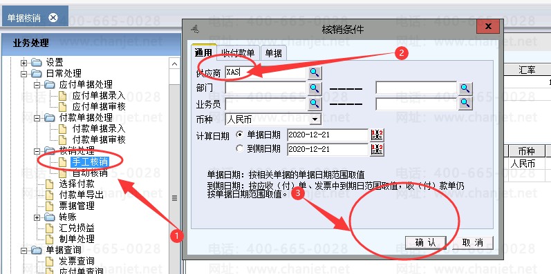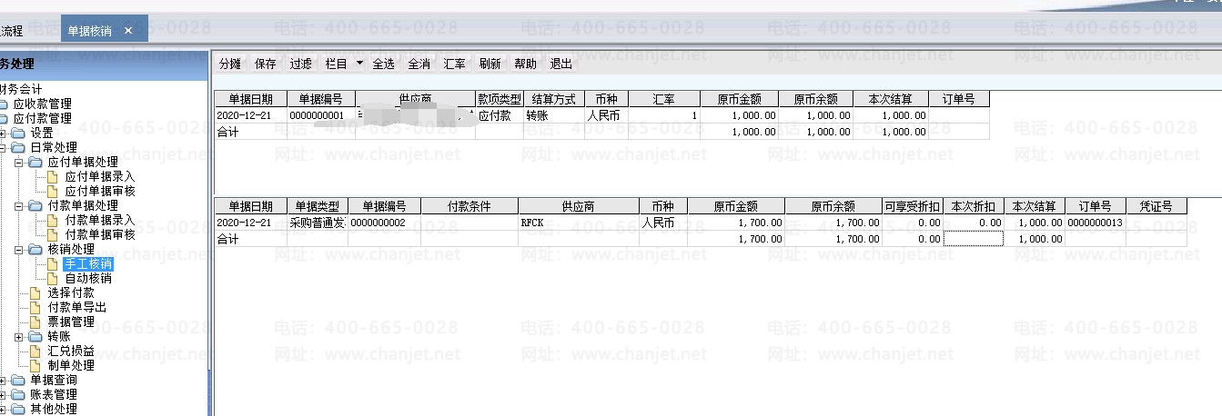 这样就形成一个先付款,后入库或者后开票的流程,下面就是要把之前预付款和这个采购发票形成的应付账款进行核销。点开手工核销,然后选择供应商,然后确定