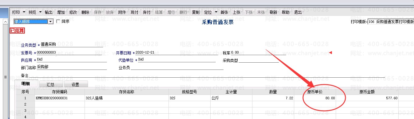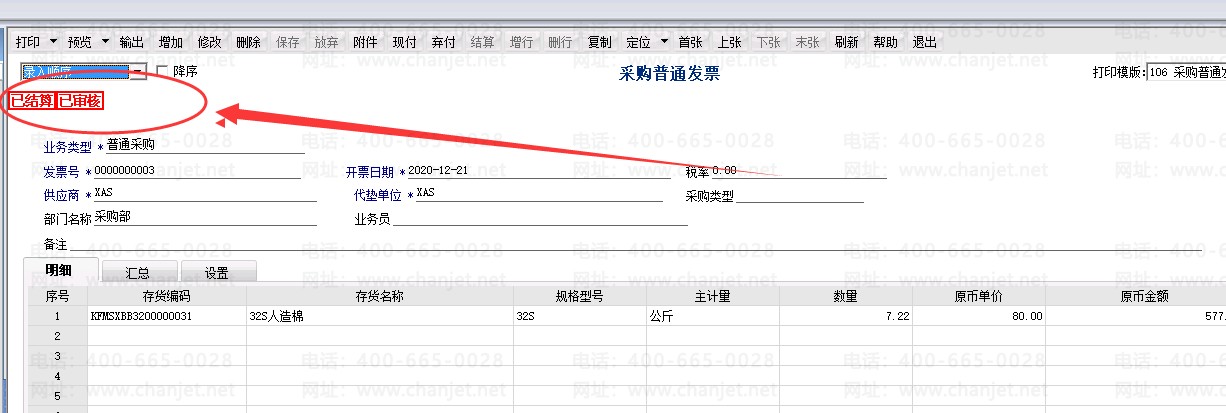 第三部,录入采购发票,进行结算,发票金额写一个,然后保存点结算。然后再去应付单审核里面将这张发票审核掉。审核之后单据左上角就提示已经审核并结算,看下面第三幅图片。