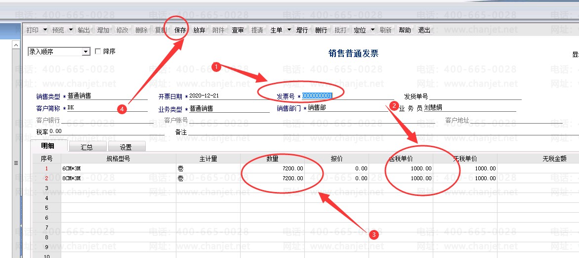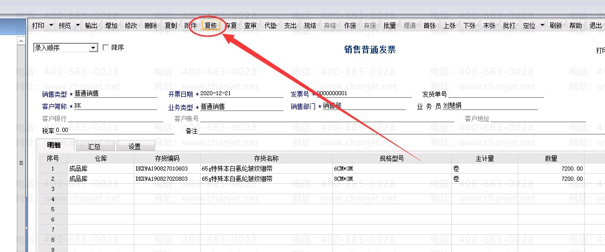 然后发票自动生成,对数量和单价进行修改,并保存。然后点复核。