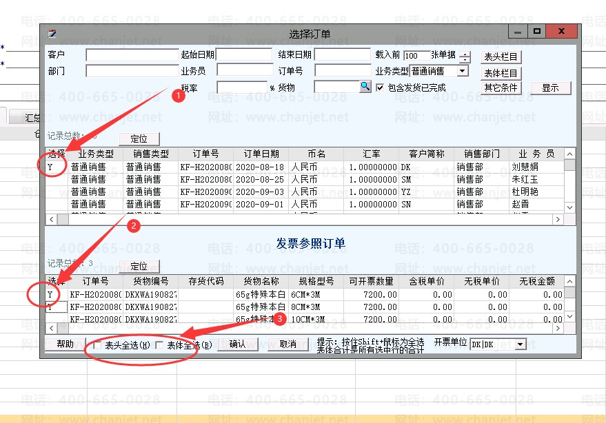 先选上面的具体某张订单,然后选该订单的下面明细,可以多个客户多张订单一起选择生成一张发票。也可以点全选,表头全选,表头全选。