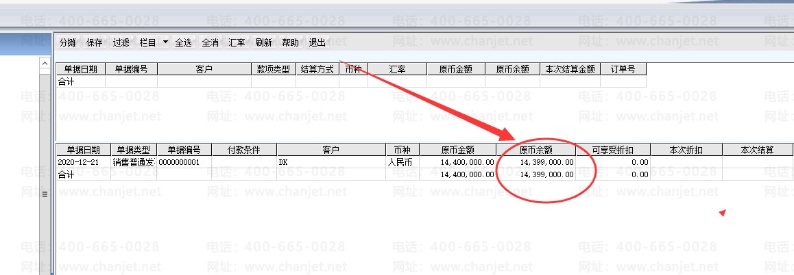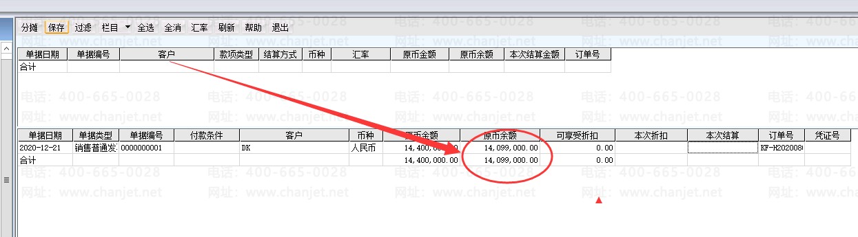 预收款一样需要核销,跟刚才选择的步骤一样,点开。过滤之后,上面显示刚才我们录入的预收款。然后上下都写一样的金额保存即可核销。