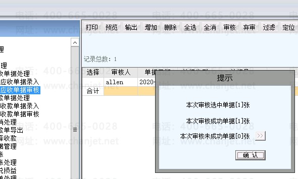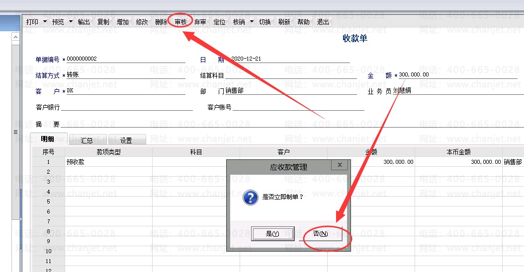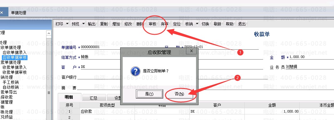接着点审核,审核提示是否立即制单,意思是要不要立即生成收款的凭证,如果没有和总账系统连接的话,点否即可。