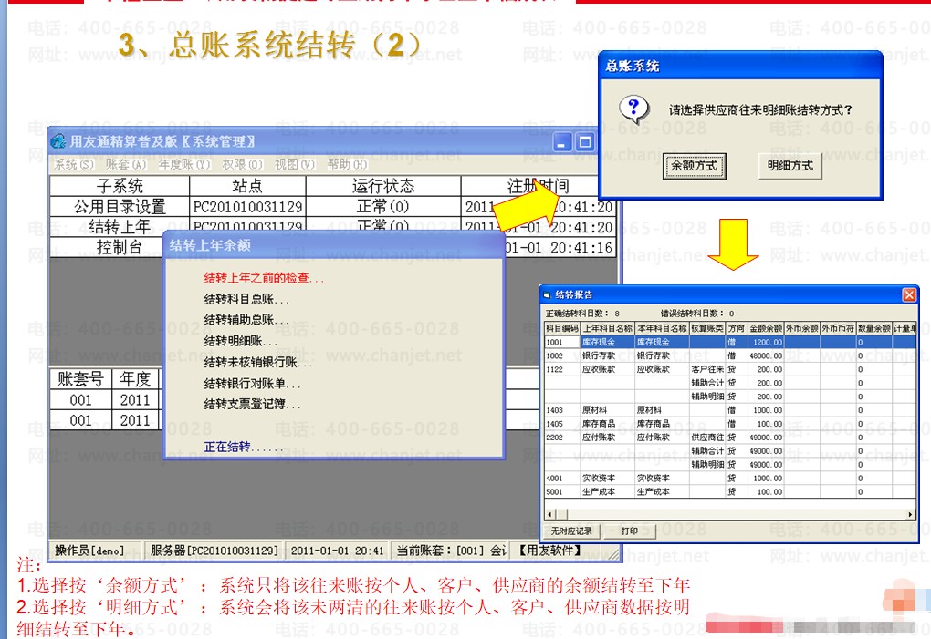 以帐套主管进入系统管理→年度帐→结转上年数据→总账系统结转→确定→1选择按‘余额方式’ (系统只将该往来账按个人、客户、供应商的余额结转至下年);选择按‘明细 方式’ (系统会将该未两清的往来账按个人、客户、供应商数据按明细结转至下年)→结转报告(确认无误后,即可关闭结转报告,从而完成总账系统的年度)