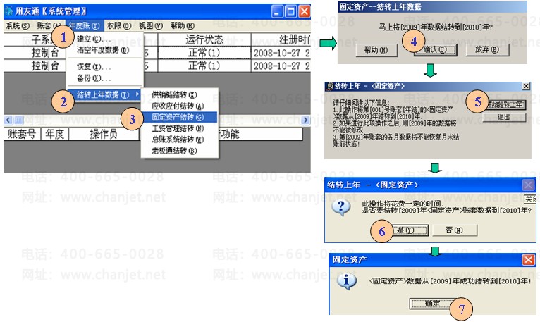以账套主管进入系统管理→年度帐→结转上年数据→固定资产结转→确定→开始结转上年→是 系统结转成功