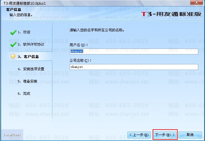 四、“用户名”和“公司名称”默认,无需更改,直接点击“下一步”。如下图所示: