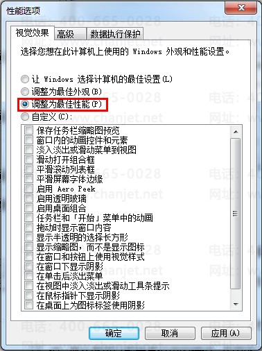 右击“我的电脑”,选择“属性”,在系统属性中选择“高级”选项卡,点击性能下的“设置”按钮,选择“调整为最佳性能”,然后“确定”。