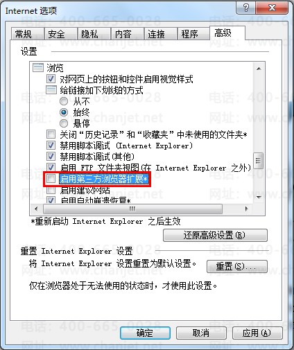 点击IE浏览器的“工具” -”Internet选项” - “高级” –“ 浏览” –取消“启用第三方浏览器扩展”的勾选,然后重新启动IE8浏览器。