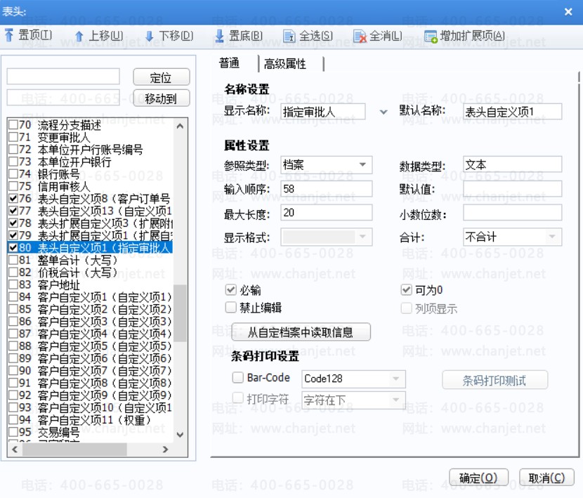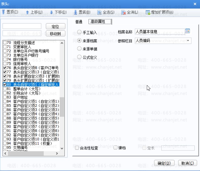 1.单据表头启用自定义项如单据头自定义项1,显示名称改为“指定审批人”并勾选“必输”;高级属性中,设置该自定义项来源于系统档案。档案名称选择人员基本信息,参照返回字段设置为“人员编码”。(注:也可以选择业务员档案,返回业务员编码)