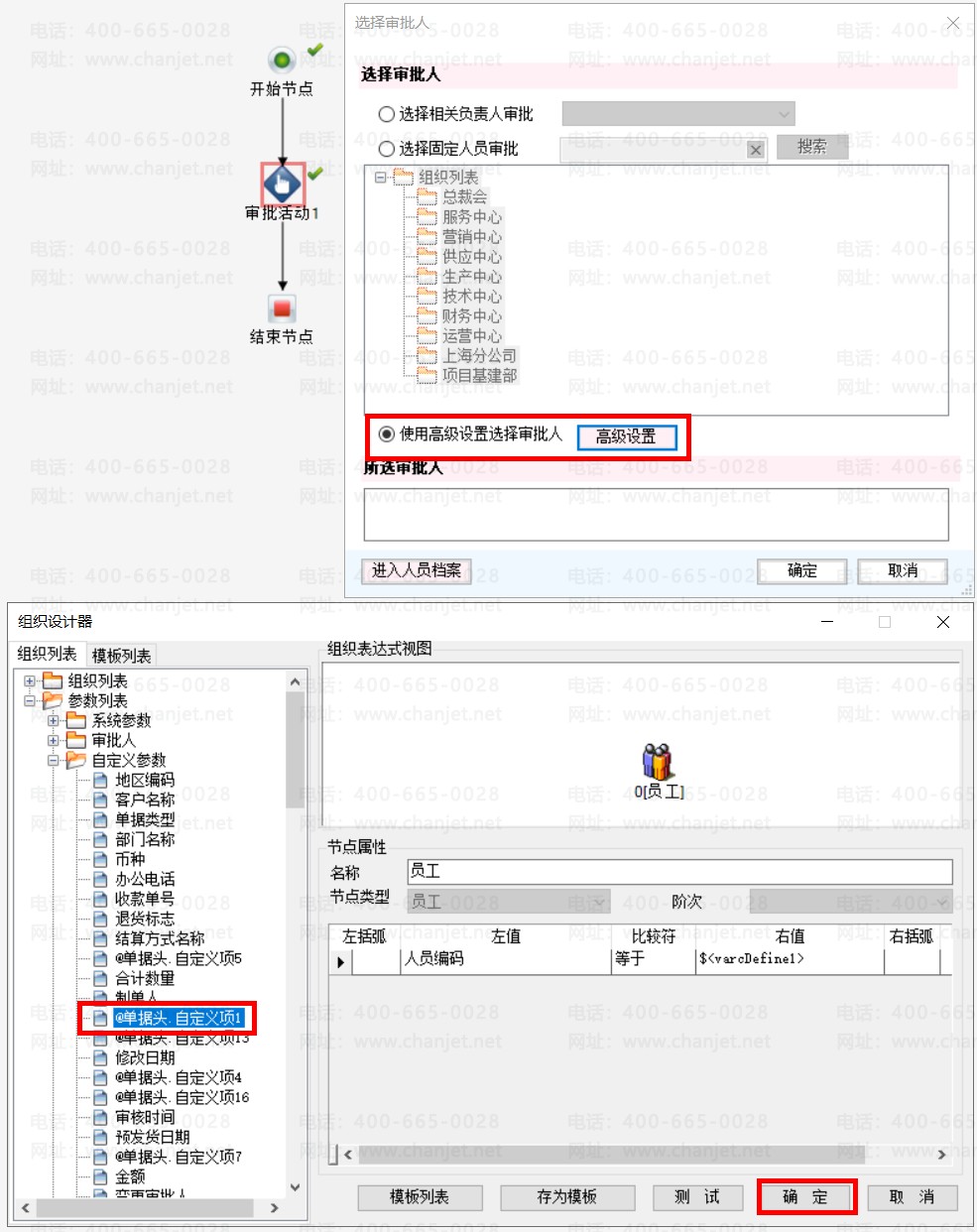 2.在工作流设计器中,审批环节设置审核人时,采用“高级设置”->组织列表->参数列表->自定义参数->双击“单据头自定义项1”保存设置即可。
