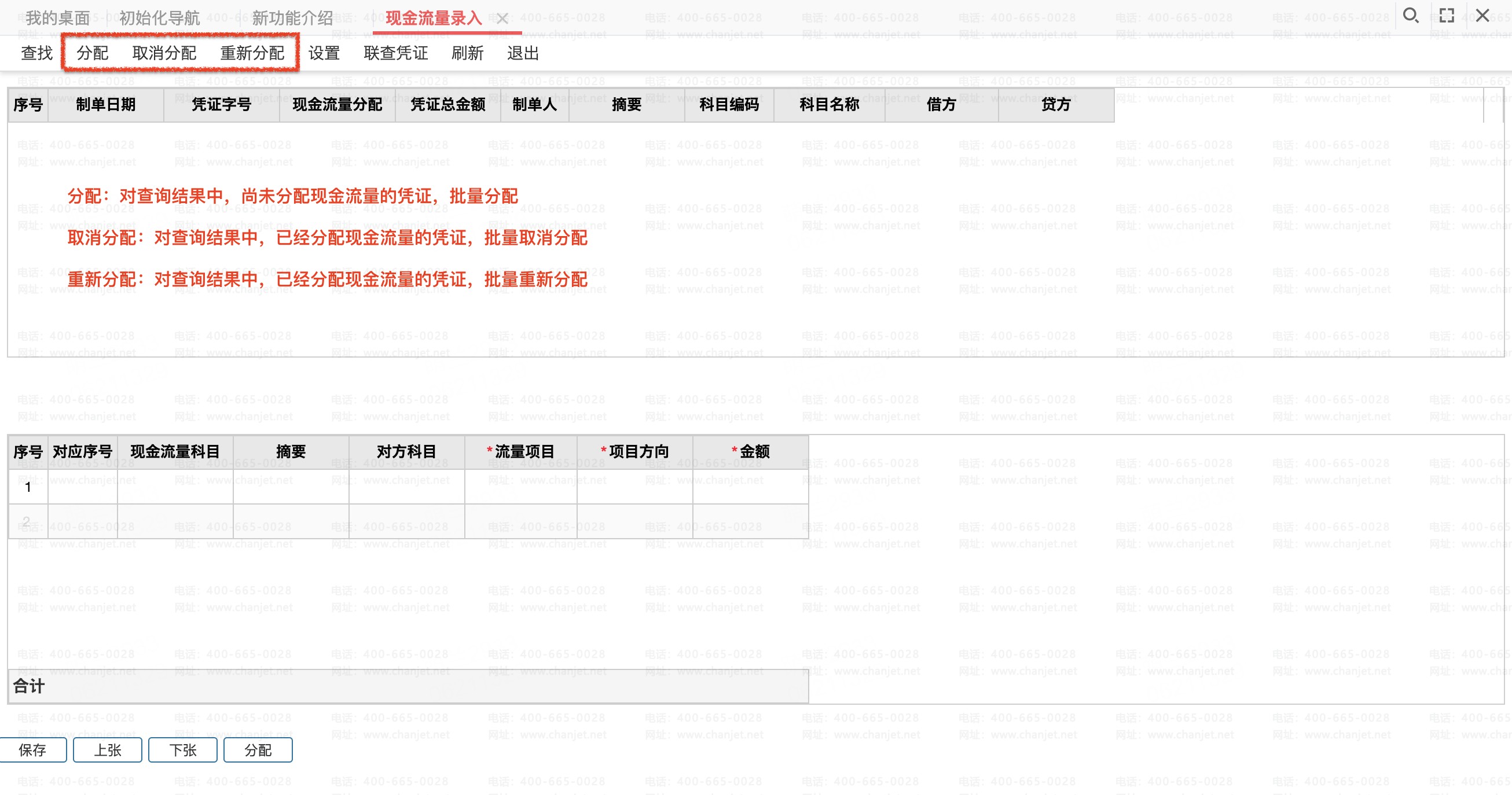在现金流量录入界面,批量分配、取消分配、重新分配 。