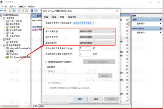 2.在服务中找到AHS Service服务,右击选择属性,在第一次失败、第二次失败和后续失败中选择【重新启动服务】