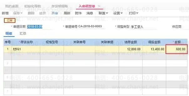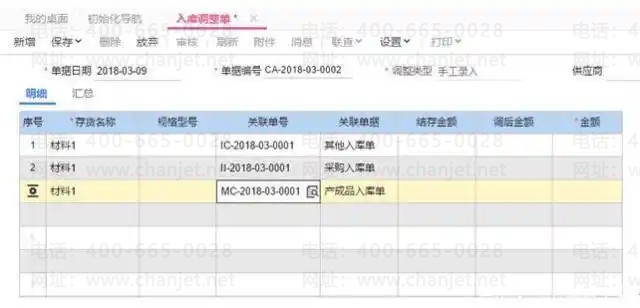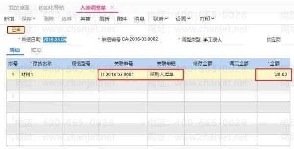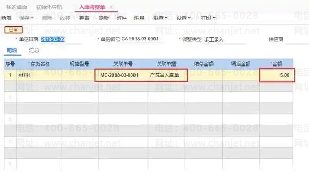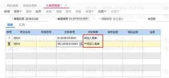 :手工调整时,如果填写了关联的入库单号,系统更新关联的原入库单号的入库成本,并以关联的入库单重新登账,调整单不登账;手工调整时,如果没有填写关联入库单号,仅对存货结存成本进行调整。