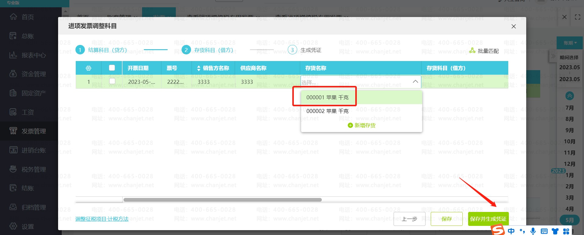 然后勾选进项发票,点击生成凭证-调整凭证,进行修改一下进项发票中的存货名称