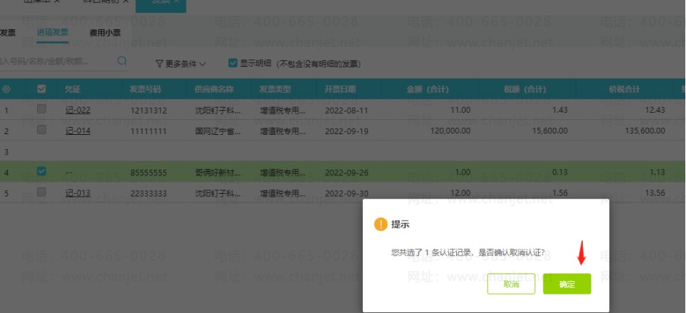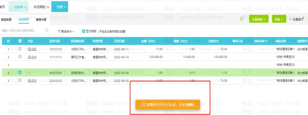 在发票管理模块,导入的发票需要删除,但是删除不了提示【发票XXXX已认证,不支持删除】