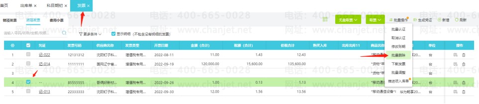 2、点击【发票管理】—【发票】-【进项发票】,点击【批量操作】-【批量删除】(注意:删除是不可逆操作,删除后无法回复,如果是只需要取消认证,只要操作第一步就可以,无需删除发票)