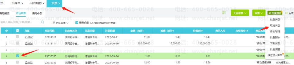 1、先取消认证,点击【发票管理】—【发票】-【进项发票】,点击【批量操作】-【取消认证】