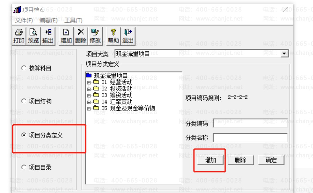 点击【增加】后在白框处输入项目编号、项目名称、所属分类码、方向