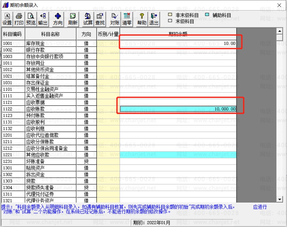 8、数据导入完成后登录软件中点击总账-设置-期初余额可以查看科目期初余额以及期初辅助明细。