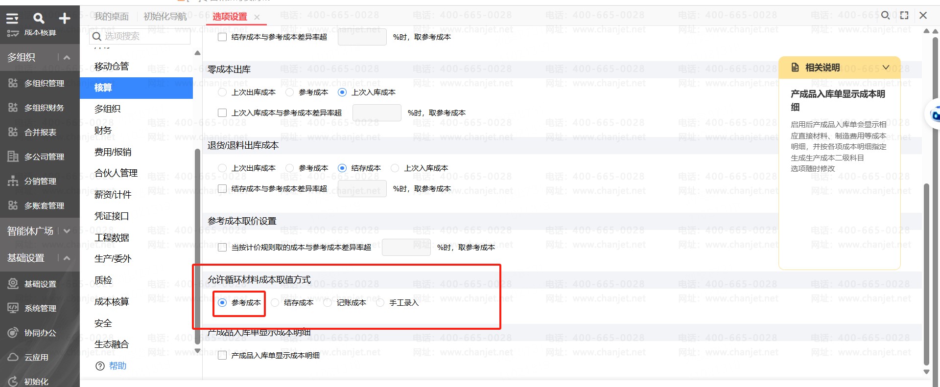 返工时材料出库是循环材料,不按存货计价法带出库成本,按选项设置里的允许循环材料成本取值方式取值。