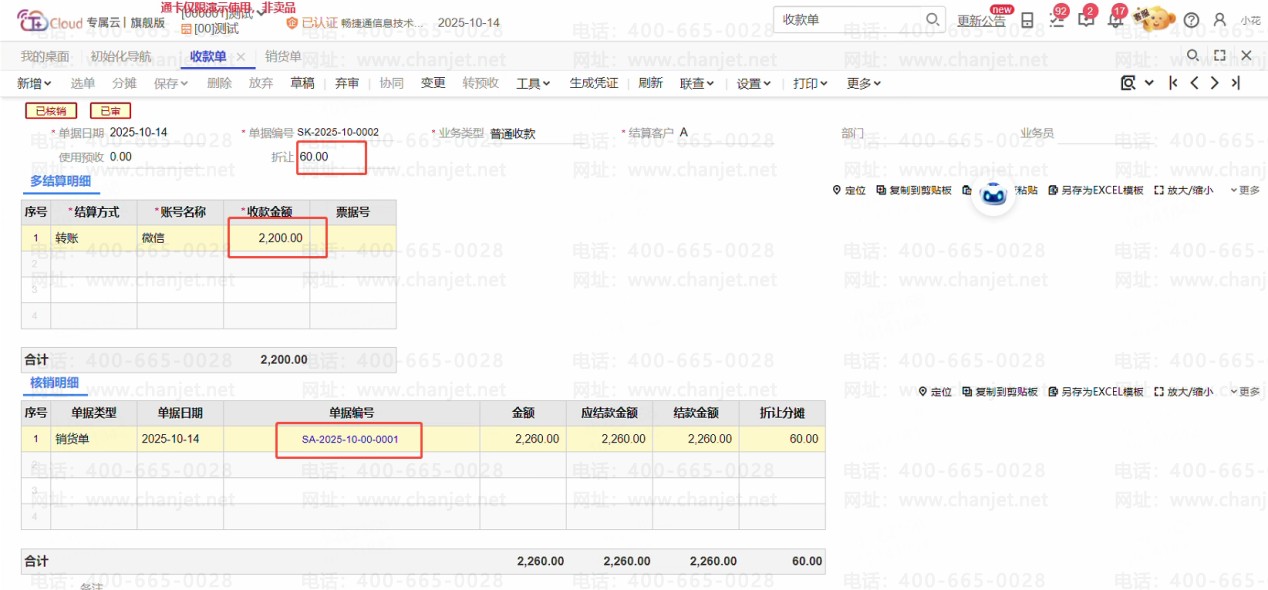2.做收款单选这笔销货单做收款,收款金额录2200,表头折让金额录60后点分摊,然后保存审核这张收款单。