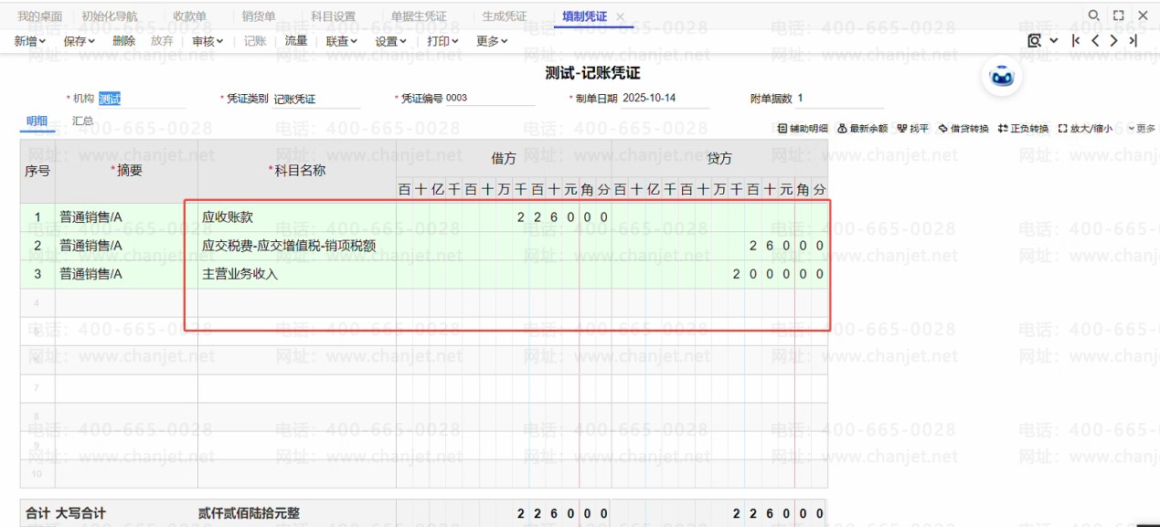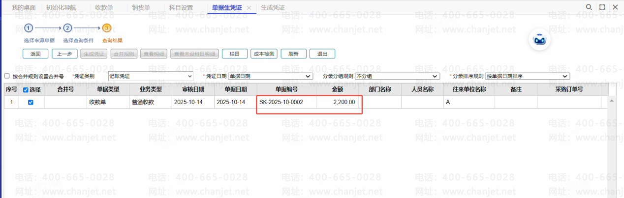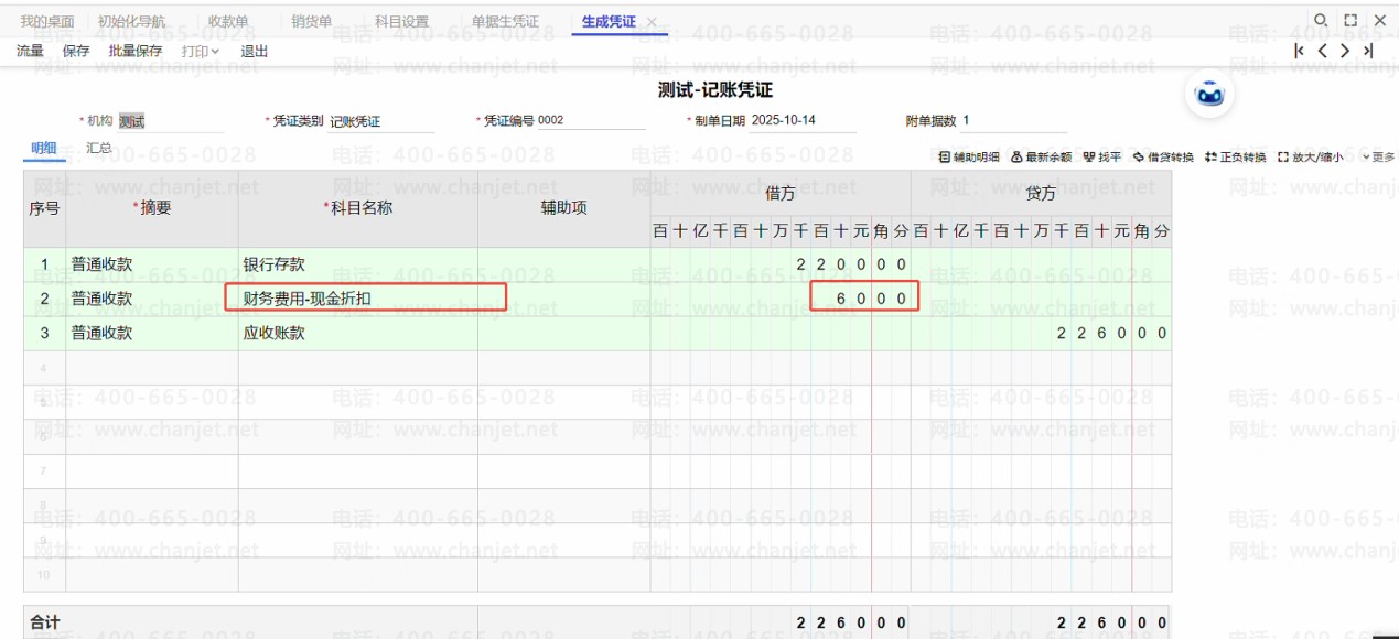 4.设置好科目后,我们去对收款单生成凭证,对应科目如下,可以自动带出折让金额60。