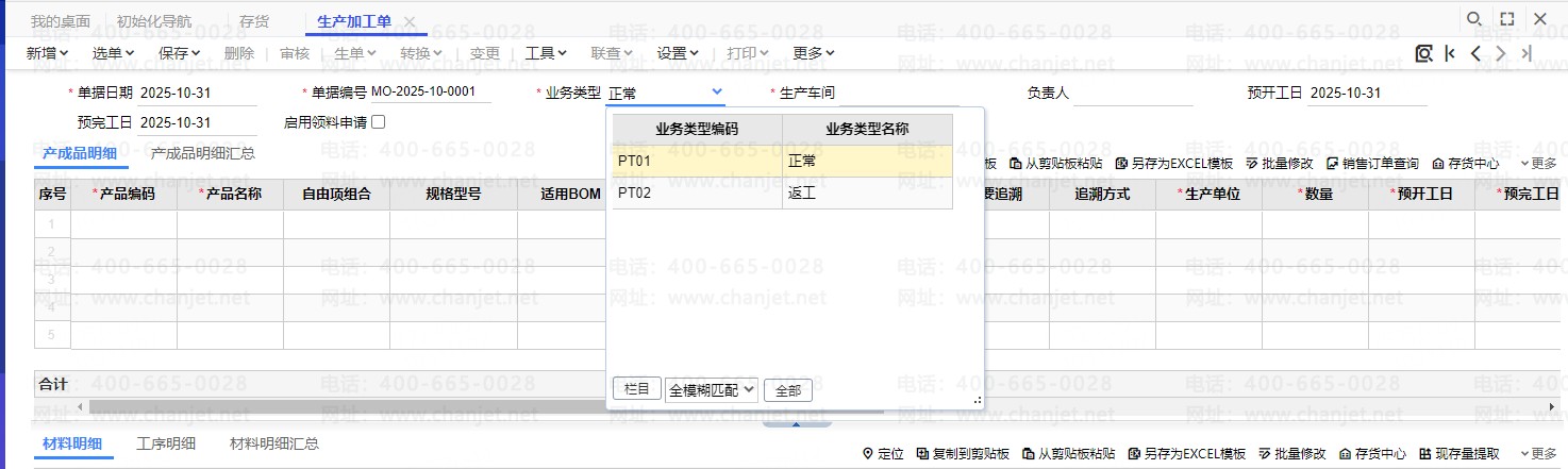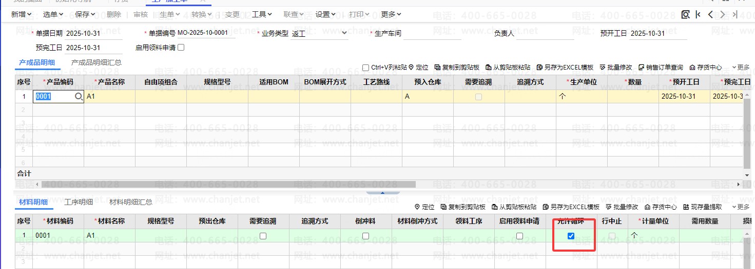 如果返工需要一些新增材料也可以直接在材料明细里面手工输入对应的材料,这些材料不需要勾选允许循环
