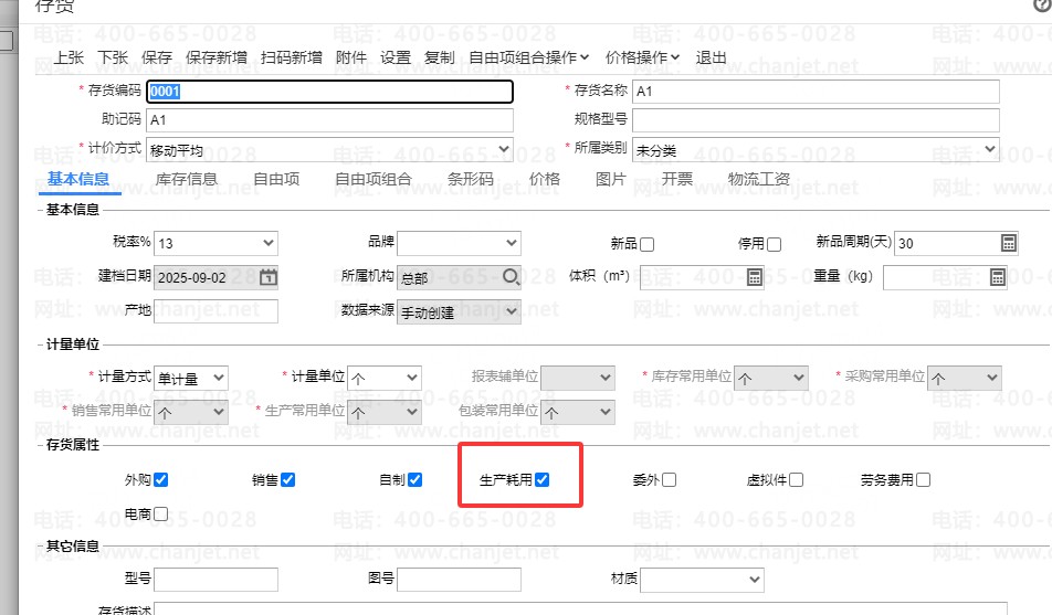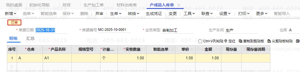 1. 正常做材料出库单,这个时候可以看到材料出库单上面的存货也是A1,在做正常的产成品入库单即可