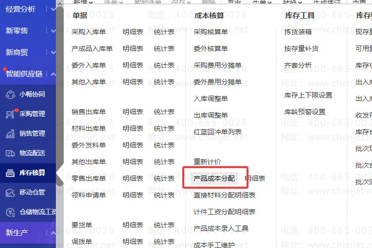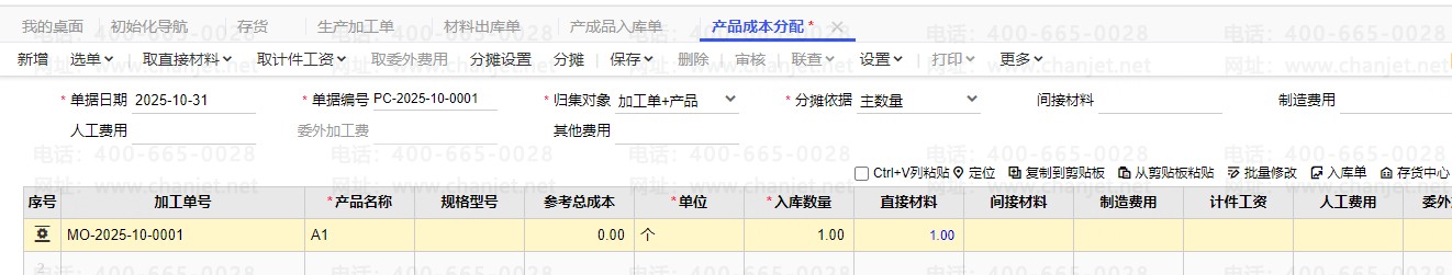 1. 在点击库存核算下面的产成品分配,选择对应的产成品入库单,点击取直接材料,进行产成品成本分配成本