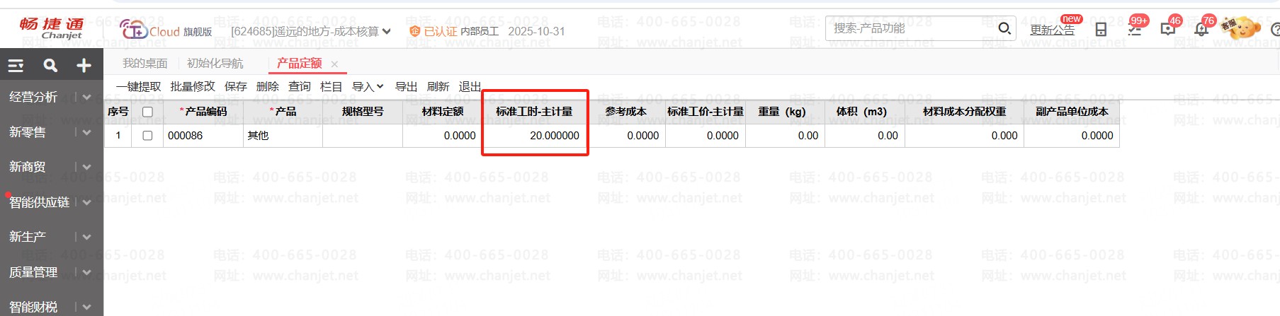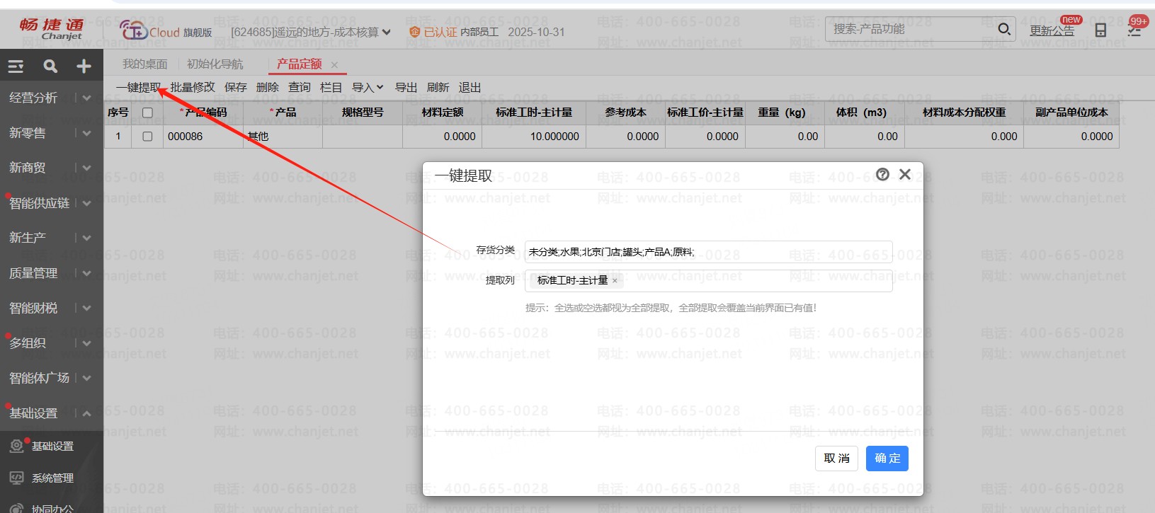 1、先在【产品定额】里重新一键提取,将档案里最新的标准工时提取到产品定额里了。