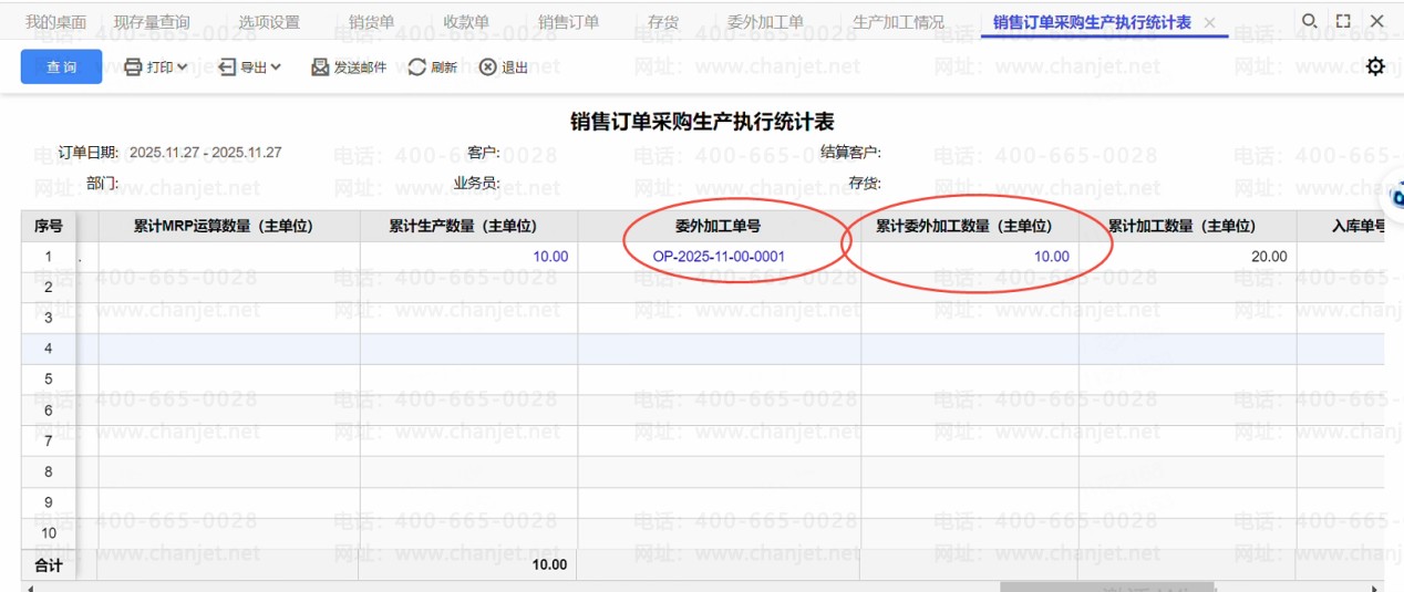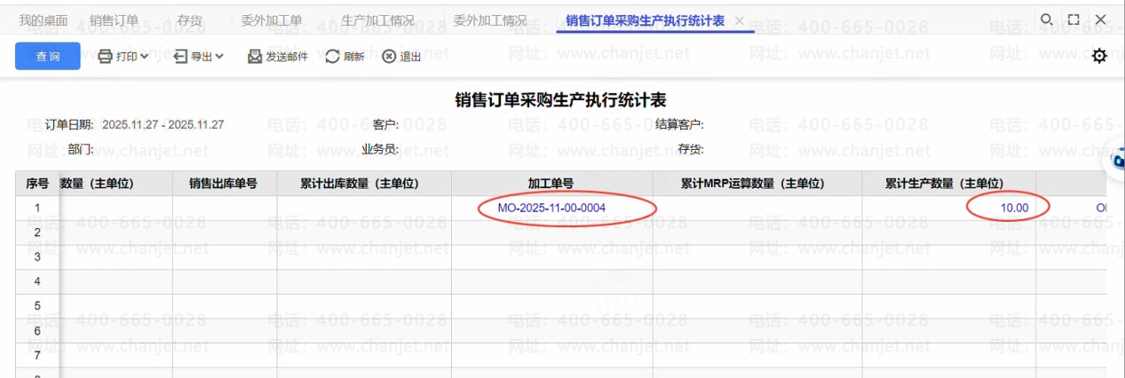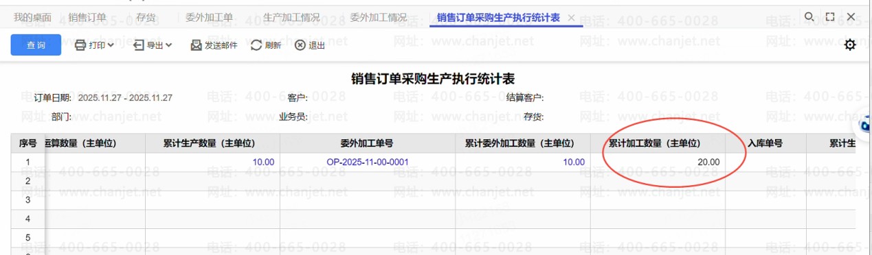 ②累计生产数量,取的是根据销售订单生成的生产加工单的数量