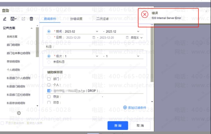 用友T+在总账查询辅助明细账和科目明细账按往来单位查询提示报错500 ‘Interal Server Error’