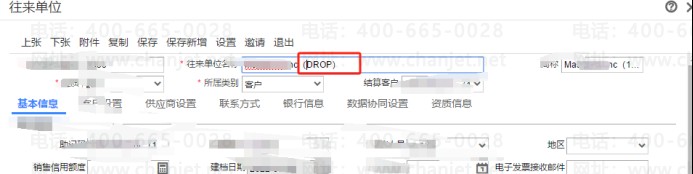 原因是这个往来单位的名称以及简称等有数据库语法之类的名称,比如说这个往来单位名称后面带有drop,这个是删除数据库表的语法,这种就不能作为往来单位名称,如图客户的往来单位名称就是有这个,改一下名称就可以了