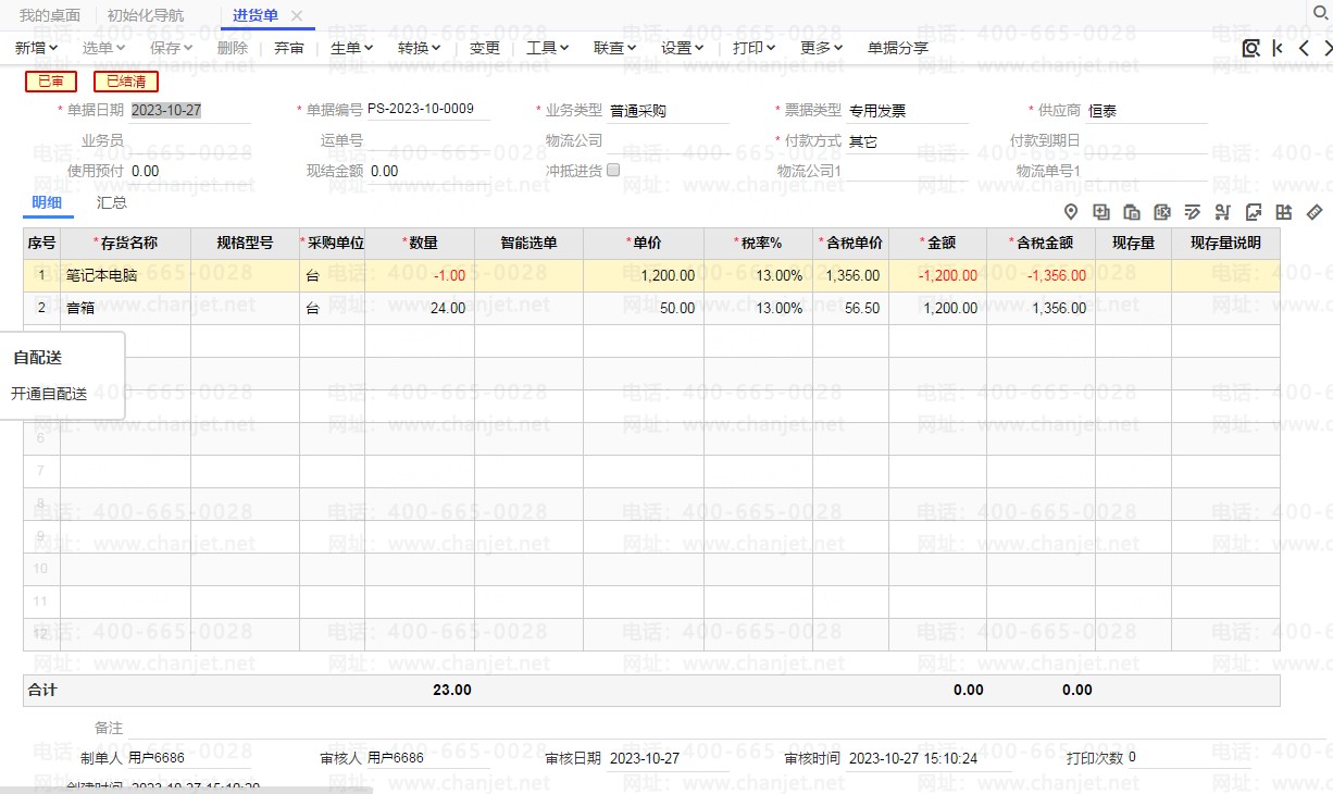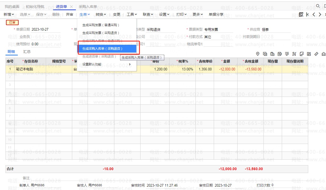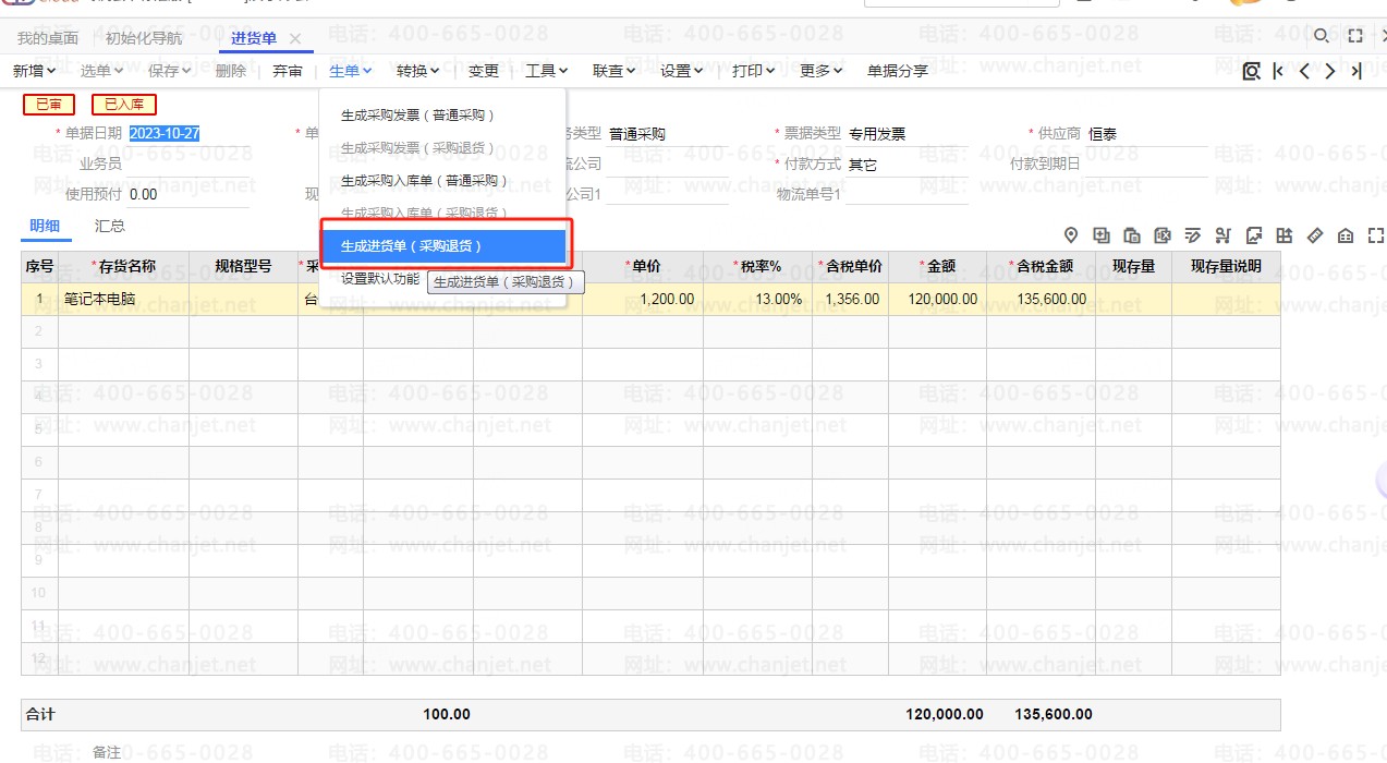 进货单流转生成两张入库单,点生单—生成采购入库单(普通采购)和生成采购入库单(采购退货)