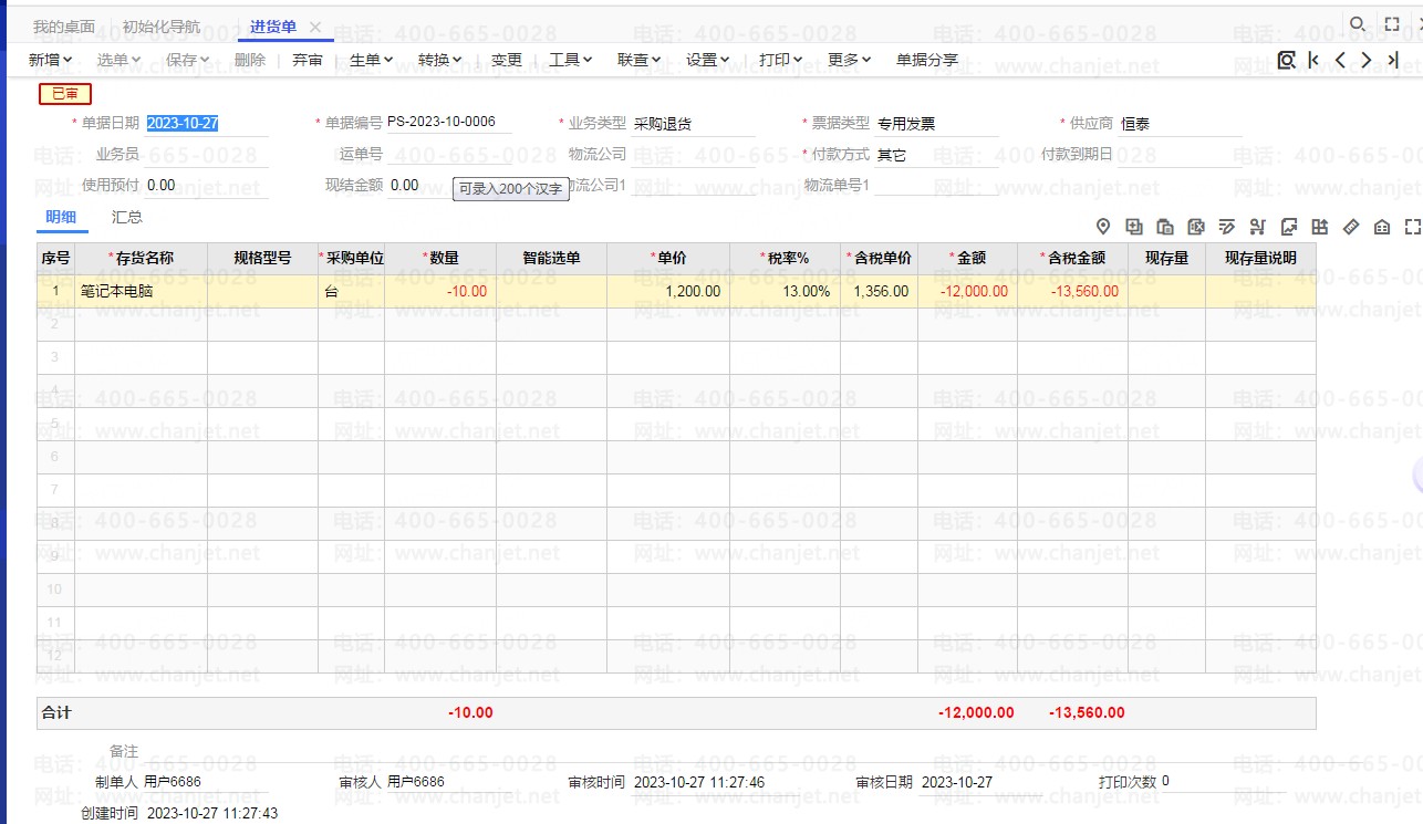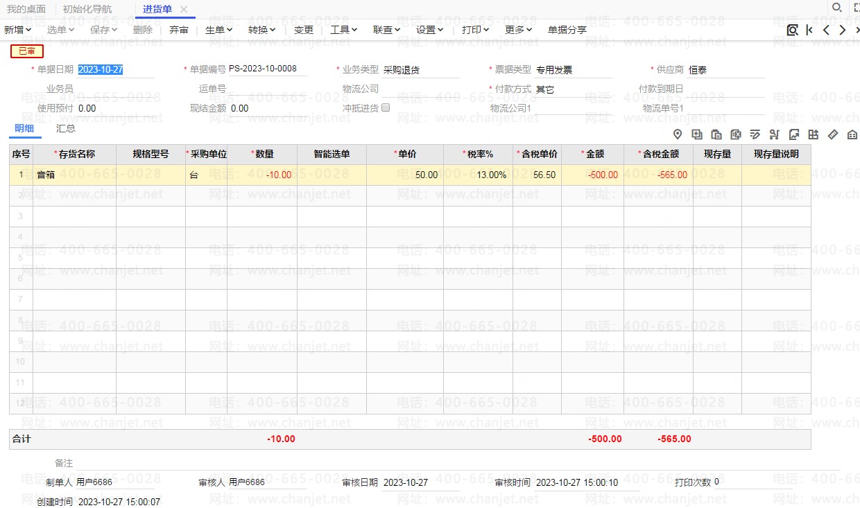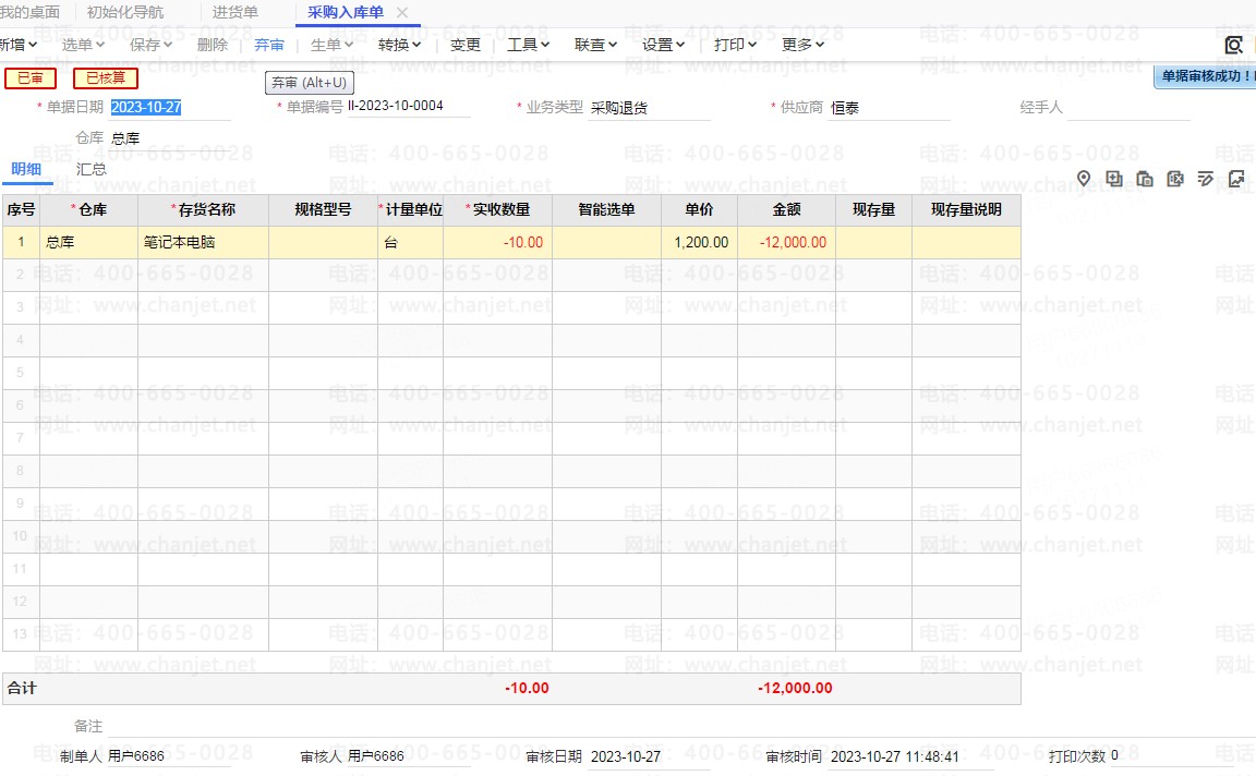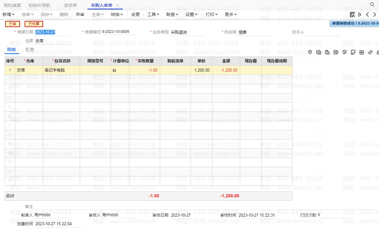 采购入库单(采购退货) 保存审核。 如图:
