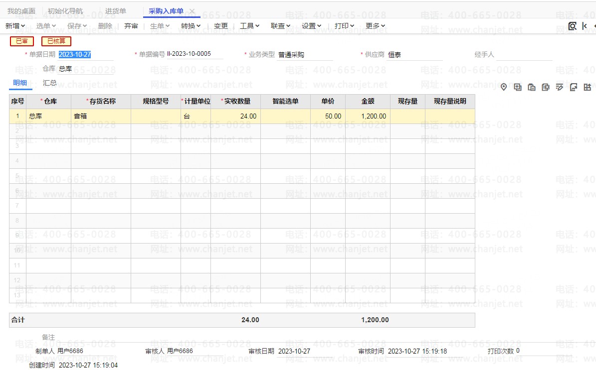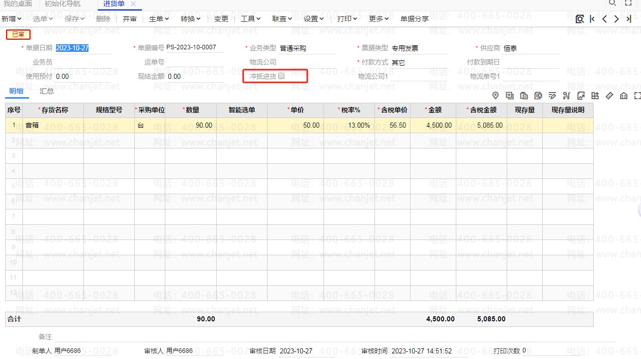 采购入库单(普通采购) 保存审核,如图:
