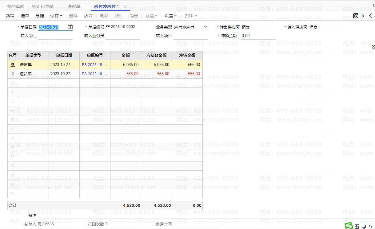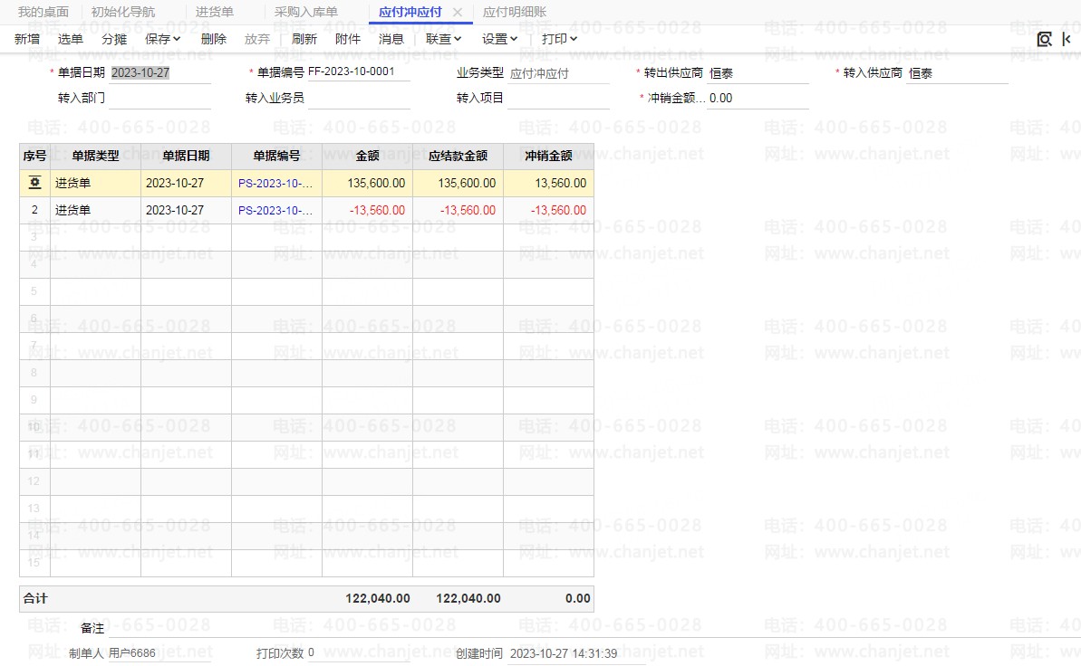 进入“住来现金,-往来冲销—应付冲应付,冲销退货数量的应付款,冲销金额合计录入为0,点击分摊后保存。如图: