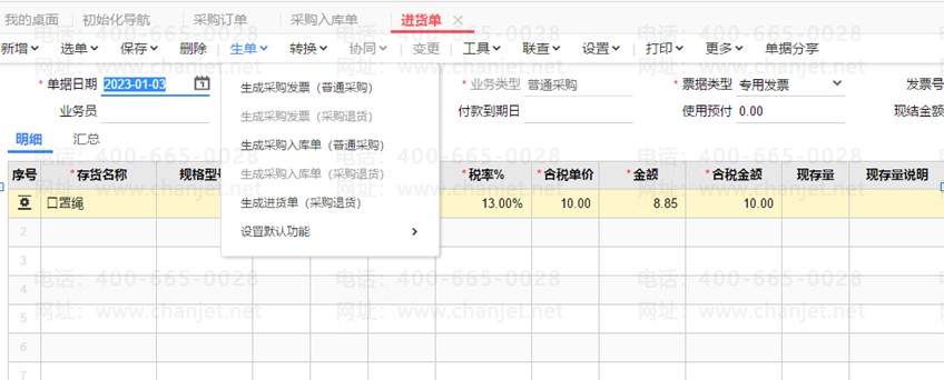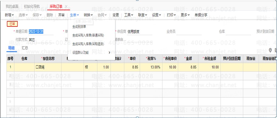 2.采购订单->进货单->采购入库单。企业可以任选其一,严格按照所选流程执行。