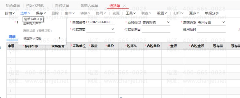 1.选择【采购订单->采购入库单->进货单】流程。