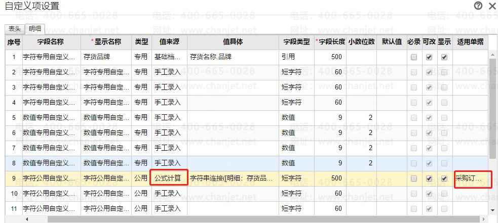 3、设置一个明细中的公用自定义项,设置好使用单据,值来源用公式计算