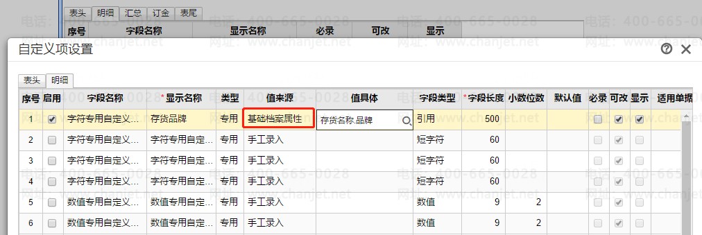 2、为单据设置一个明细的专用自定义项,值来源为“基础档案属性”,实现在最上游单据中,先将品牌值带出