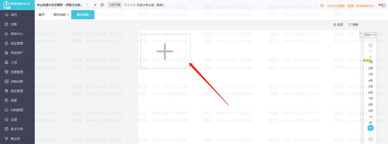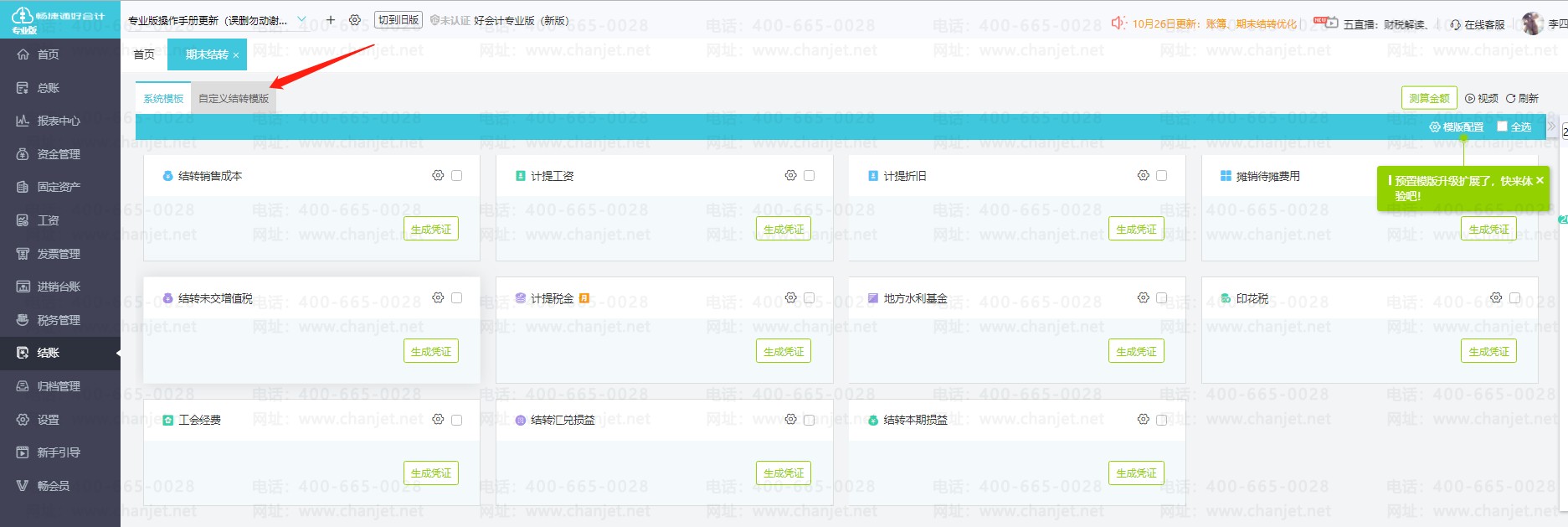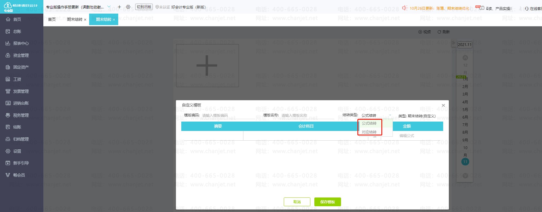 ①在好会计中,进入【结账】-【期末结转】页面,左上角找到自定义结转模板。
