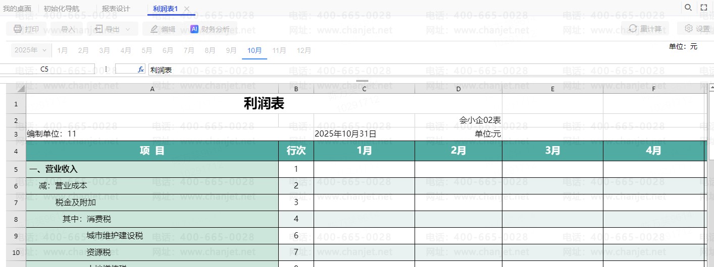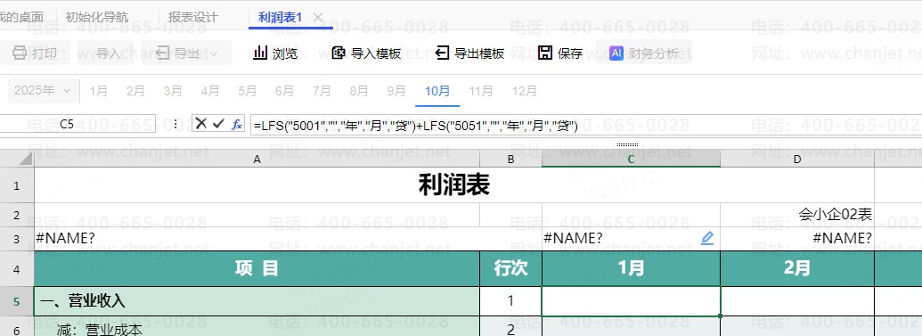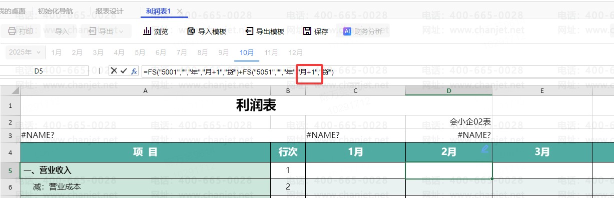1.设置对应的报表模板,我们可以在报表里面加入12列,分别以1-12月命名,以营业收入为例,其中1月报表公式还是正常的FS("5001","","年","月","贷")+FS("5051","","年","月","贷"),这个时候将2月的公式改为FS("5001","","年","月+1","贷")+FS("5051","","年","月+1","贷"),3月的公式是FS("5001","","年","月+2","贷")+FS("5051","","年","月+2","贷"),以此类推,12月的公式就是FS("5001","","年","月+11","贷")+FS("5051","","年","月+11","贷")
