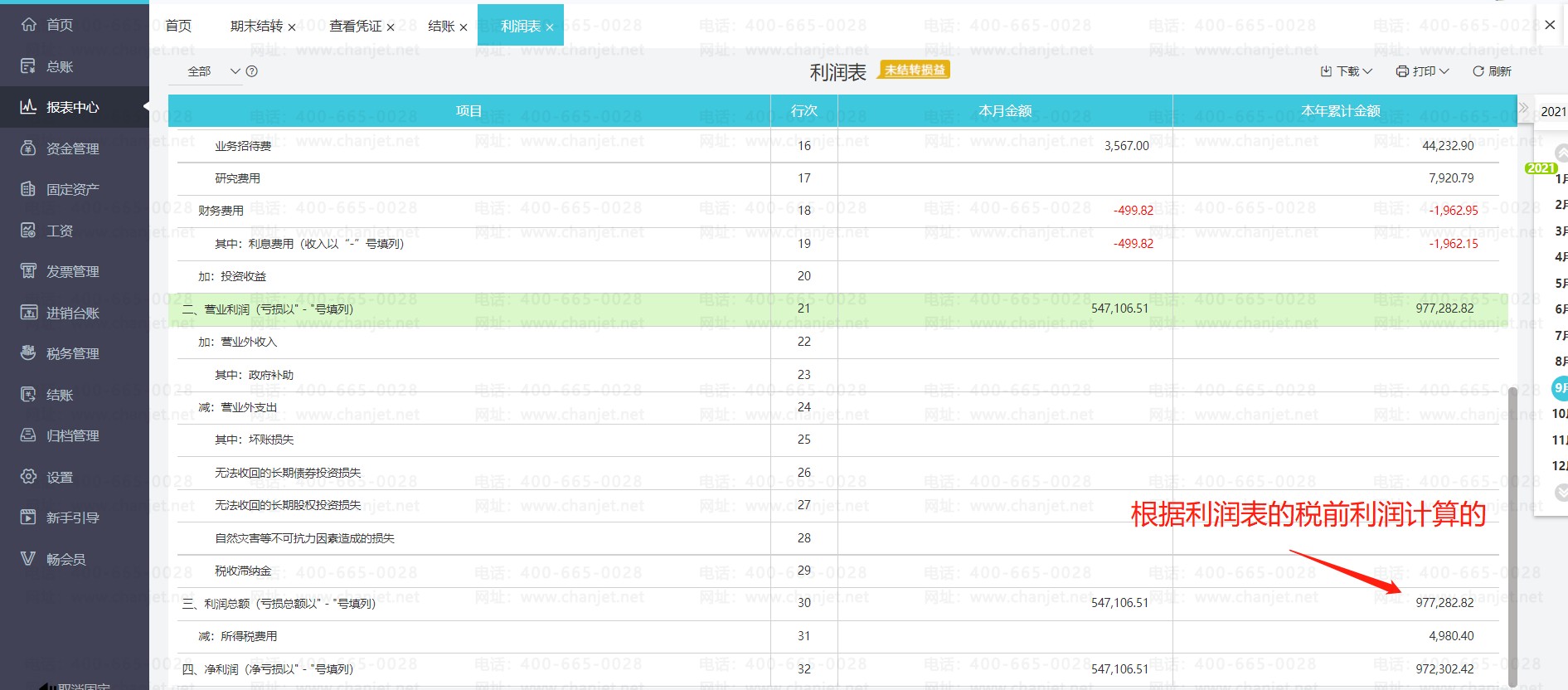 1、企业所得税金额是根据利润表的税前利润乘以对应所得税比例 减去 已交税金 计算的出来的,进入报表中心 利润表,查看利润总额。