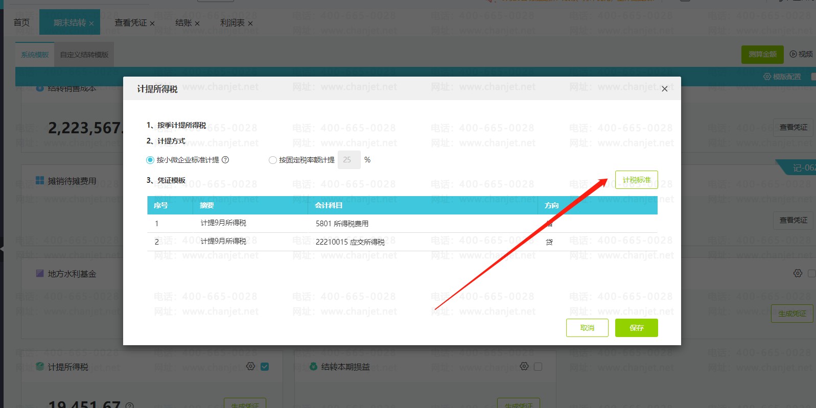 3.如果特殊行业或者当地有税收优惠政策,有特定的所得税优惠税率可以点计税标准设置比例,保存后,点测算金额,生成凭证。