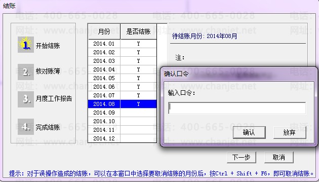 1、登入8月份进行操作,依次点击“总账系统-月末结账”,选中相应的月份,同时按住ctrl+shift+f6键取消结账,输入主管口令,点击“确认”,8月份中的Y标志消失。如图: