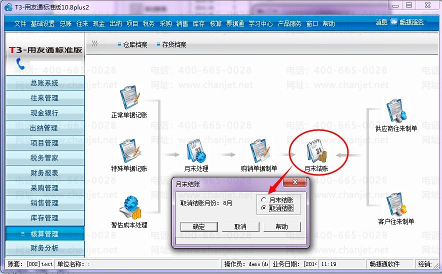 核算模块取消月结时提示:“总账系统8月份已结账,不能恢复月末结账”。如图: