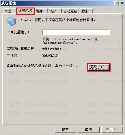 2、在计算机名称下输入计算机名(注意:8位以内的英文字母,如ufida,cw,admin等都可以,但千万不要包含特殊符号,中文等),修改好后点击“确定”按钮。系统会提示需要重新启动计算机,点击“确定”,重新启动电脑就更改好计算机名称了。如下图所示: