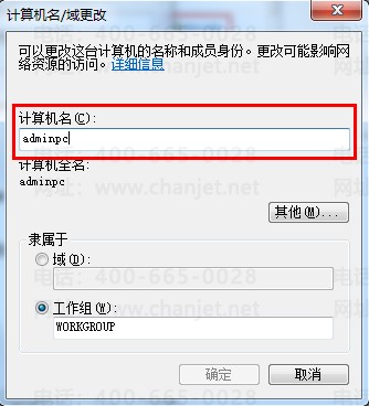 2、在计算机名称下输入计算机名(注意:8位以内的英文字母,如ufida,cw,admin等都可以,但千万不要包含特殊符号,中文等),修改好后点击“确定”按钮。如下图所示: