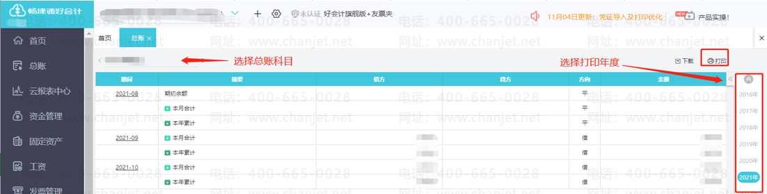 2.1选择总账科目,对应的打印年度(系统的总账是按照年度打印的),点击打印